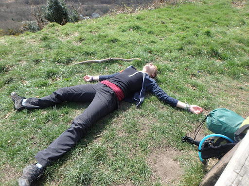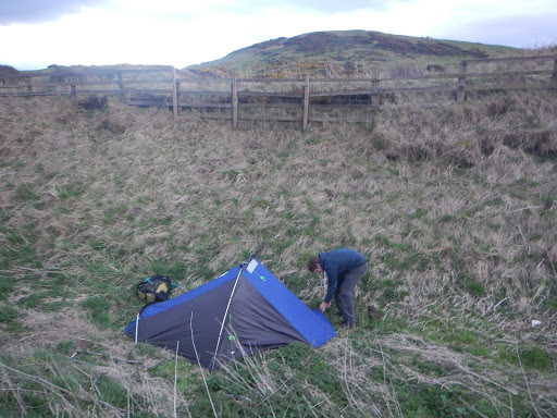 The first tent location we scouted was too windy so I walk on optimistically hoping to find a better side. Luckily I do as when I return to Joe he’s laying flat on the tent attempting to prevent it from blowing away. I’d found a little ditch area next to a freight train line so we camped beside it. It’s surrounded by nettles but it was out of the wind and once it’s up we sleep rather well. Only the occasional freight rattles by.