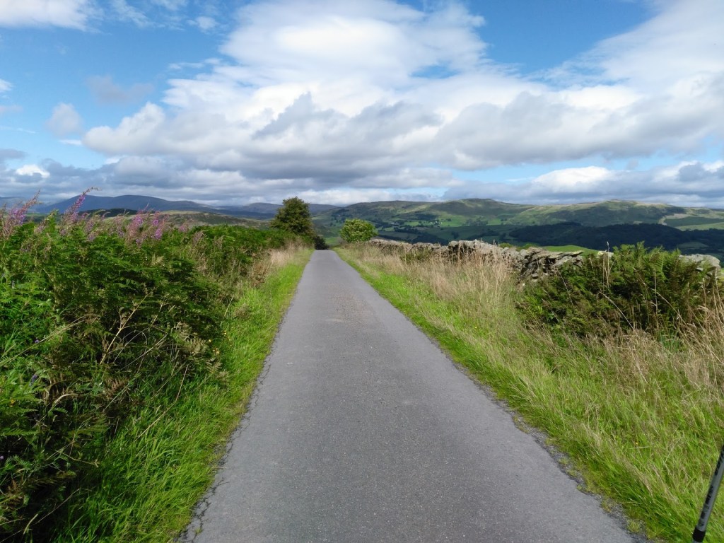 I took a photo and we continued on our way. Up a lengthy cement track which seems never ending. One continuous slog. I’m sweating at the top. Passed a white house and we arrived at the top. We took a breather and can see the hills of the Lake District behind us. Next we passed the black moss tarn and we met a second diversion. It lead us down into a hamlet and we took the first right. Big mistake. We ended up passing some houses and entered a field of sheep. We fence hopped and go up to the main road again. We figured out where we went wrong and head back to the start of the diversion. I took a photo of the diversion and off we go again taking the second right.