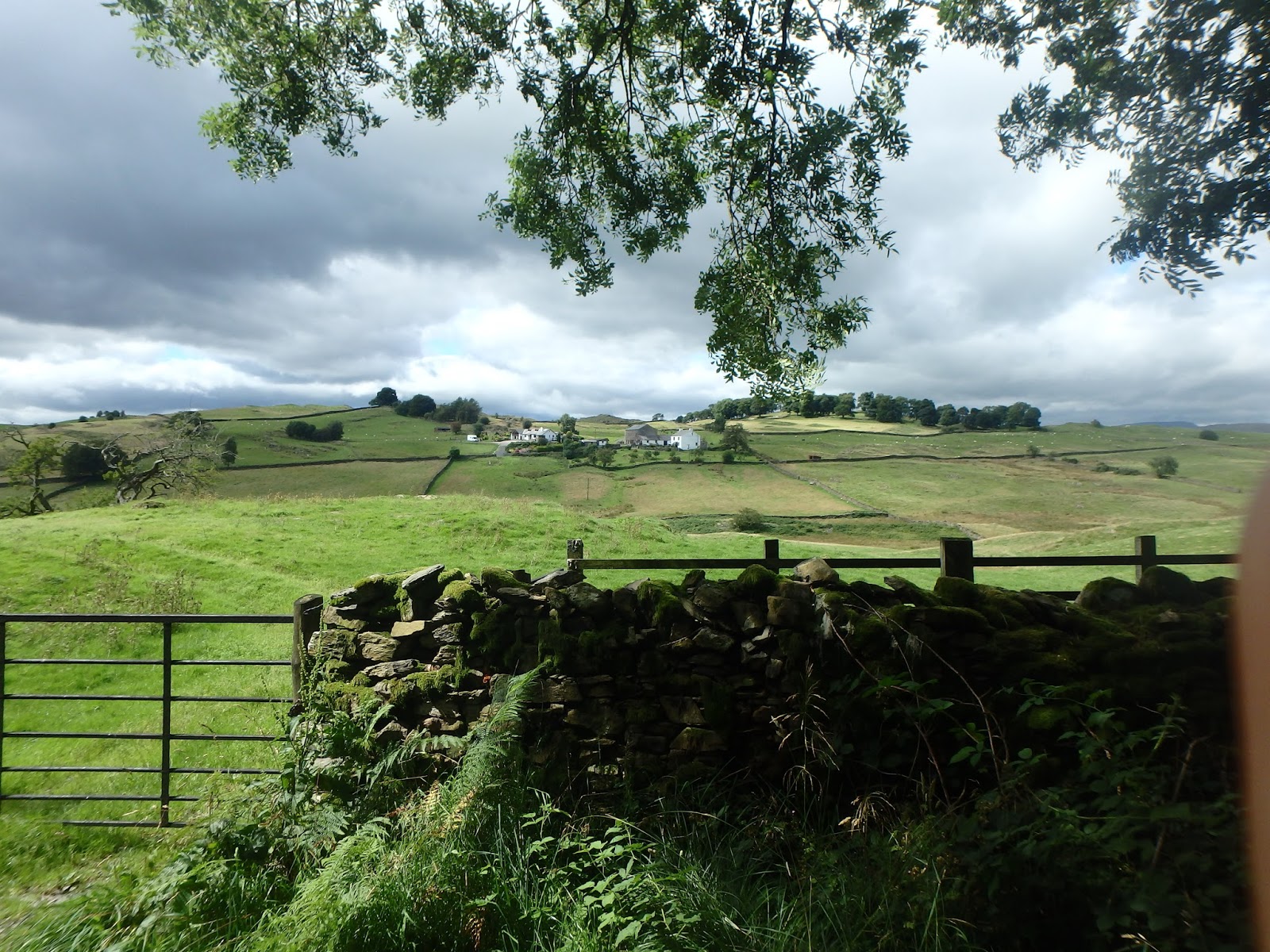 I took a photo and we continued on our way. Up a lengthy cement track which seems never ending. One continuous slog. I’m sweating at the top. Passed a white house and we arrived at the top. We took a breather and can see the hills of the Lake District behind us. Next we passed the black moss tarn and we met a second diversion. It lead us down into a hamlet and we took the first right. Big mistake. We ended up passing some houses and entered a field of sheep. We fence hopped and go up to the main road again. We figured out where we went wrong and head back to the start of the diversion. I took a photo of the diversion and off we go again taking the second right.