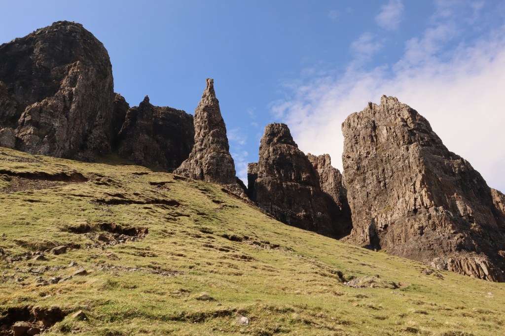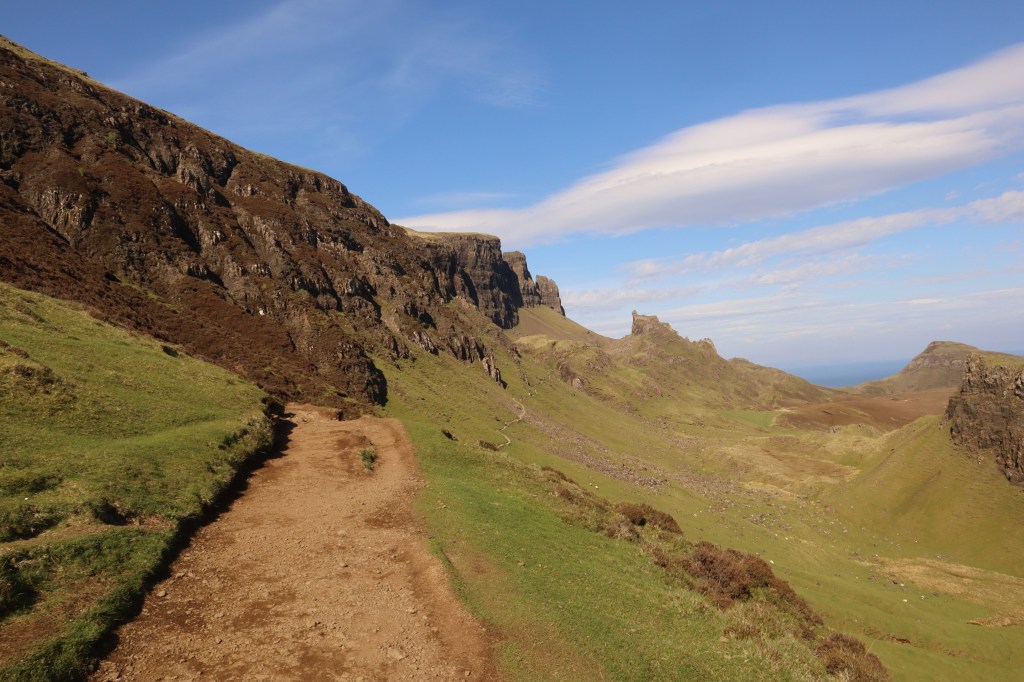 We follow the ups and downs of the cliff edge and pause for lunch. I have cous-cous and cake before we march on. Leaving the coast we head inland passing the Skye hostel. Over the road we head up into the hills, into a section which is inundated with day trippers, a wedding and city dwellers. Passing Loch Langaig and Loch Hasco, up and up we go, gazing at the lochs below, the wind catching on the water and marring the surface. We hike on and pass beneath the Quiraing which has a mini fleet of day walkers marching to and fro. Then the wind picks up, blitzing though and threatening to whip our caps from our heads.