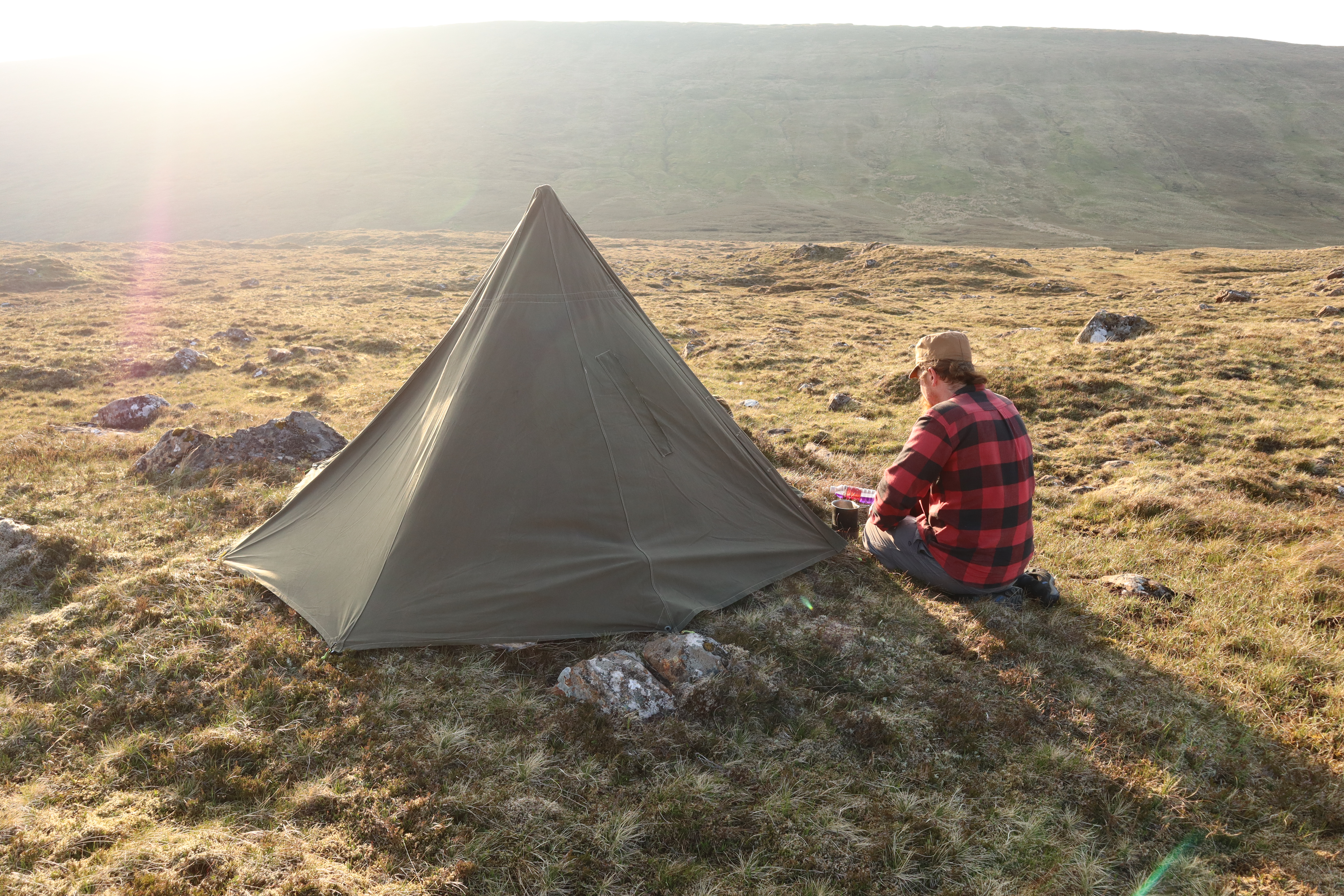 Snacks demolished, we headed up towards Bioda Buidhe hoping to find somewhere acceptable to camp – out the wind and not on a boggy spot… Up and over the ridge, we followed the well trodden path which has created deep marsh areas with spongy, bouncy steps. Descending down we could see the impressive Trotternish Ridge looming and what we’d be climbing tomorrow. Another camper was strategic-ly camped behind an old stone wall but pitched in the firing path of the wind, the valley funnelling the gale down the centre.