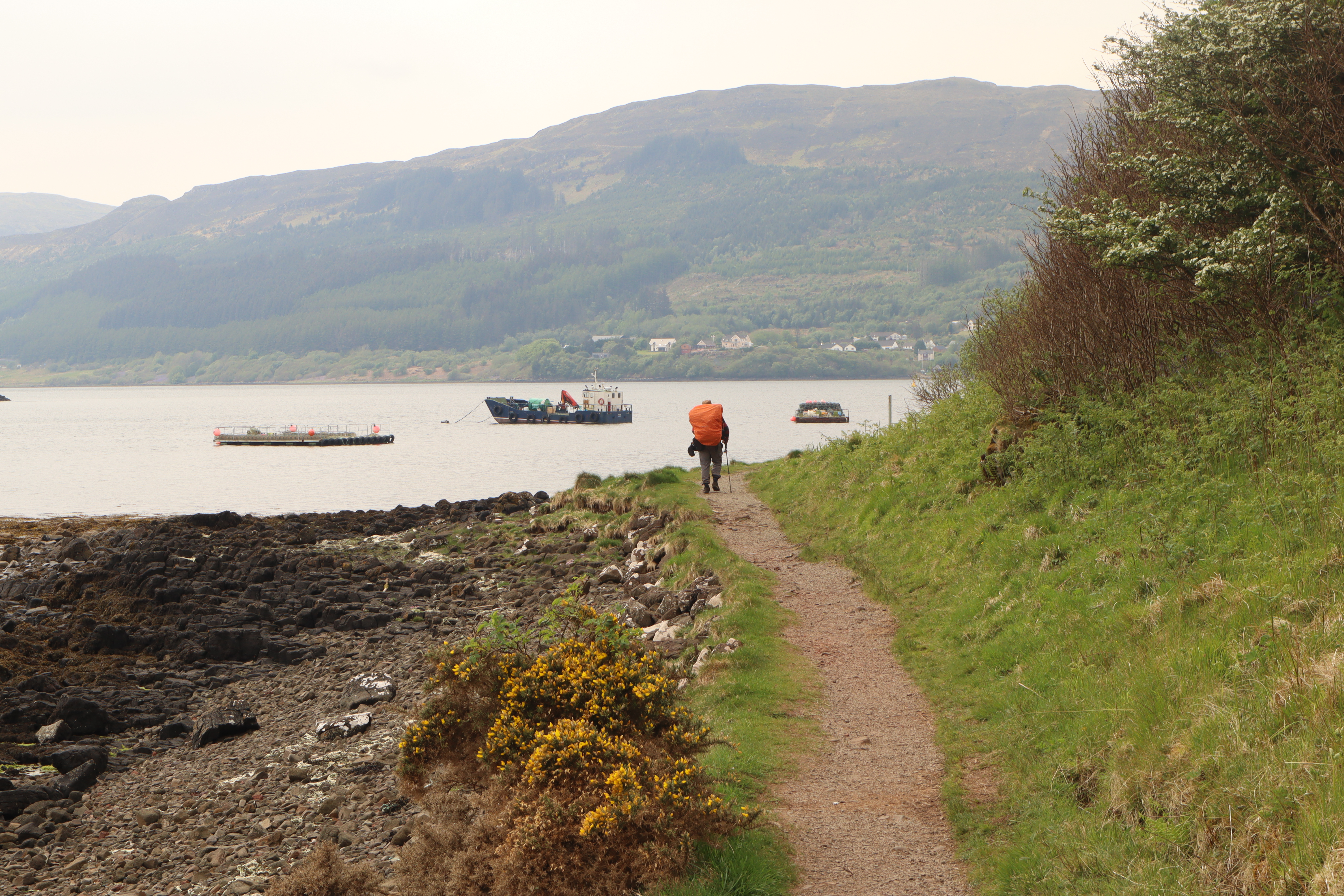 Finally we’re on the descent and the rain comes with us so we pause and zip into our waterproofs. Locals and dog walkers start appearing signalling that we must be getting close. We reach the shoreline and follow a pleasant walk into town. We pop into a hectic Co-op full of tourists and a shop assistant who looks dead inside.