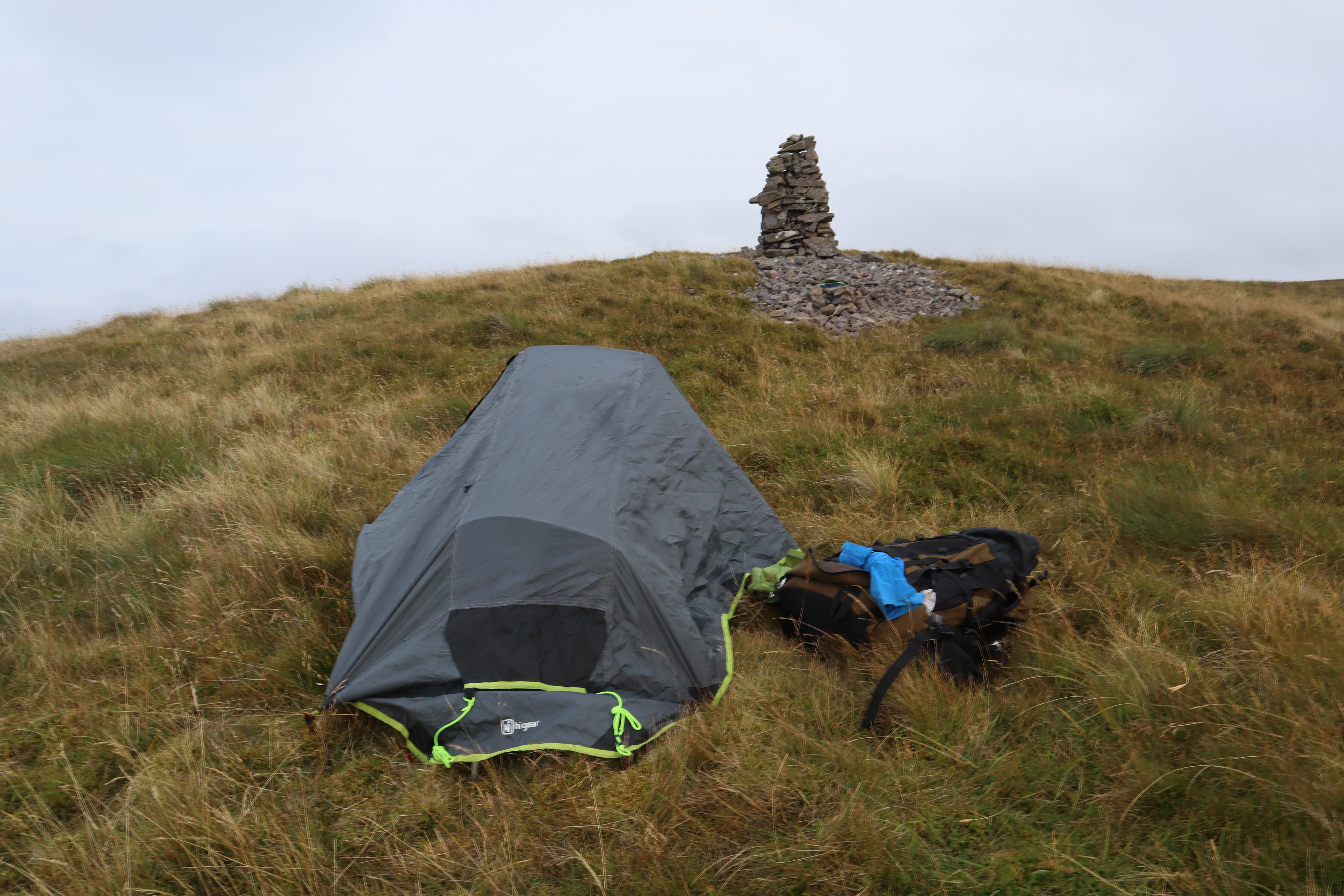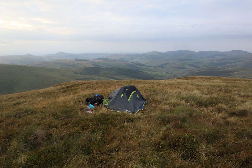 Reaching the bottom I meet flagstones and appreciate the level surface enabling me to devour miles. It is amazingly dry, even the boggy patches have cracks running through them. The late afternoon fades away into the evening and I turn off trail to pitch. Being in Scotland, I can legally camp anywhere and I do so. There is no one else around for miles and I pitch my small one person tent and wait for my cous cous to rehydrate. I’m pitched near a cairn and a geocache peers out from it. I gleefully sign my name, inhale a few chocolate digestives and close the door to my tent. It’s not meant to rain but low clouds are visible on the horizon meaning I’ll most likely wake to a wet tent anyway.